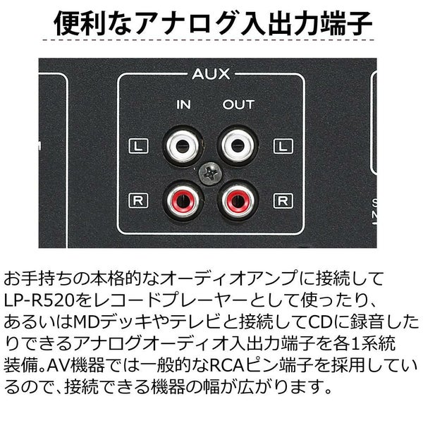お手持ちの本格的なオーディオアンプに接続してLP-R520をレコードプレーヤーとして使ったり、あるいはMDデッキやテレビと接続してCDに録音したりできるアナログオーディオ入出力端子を各1系統装備。