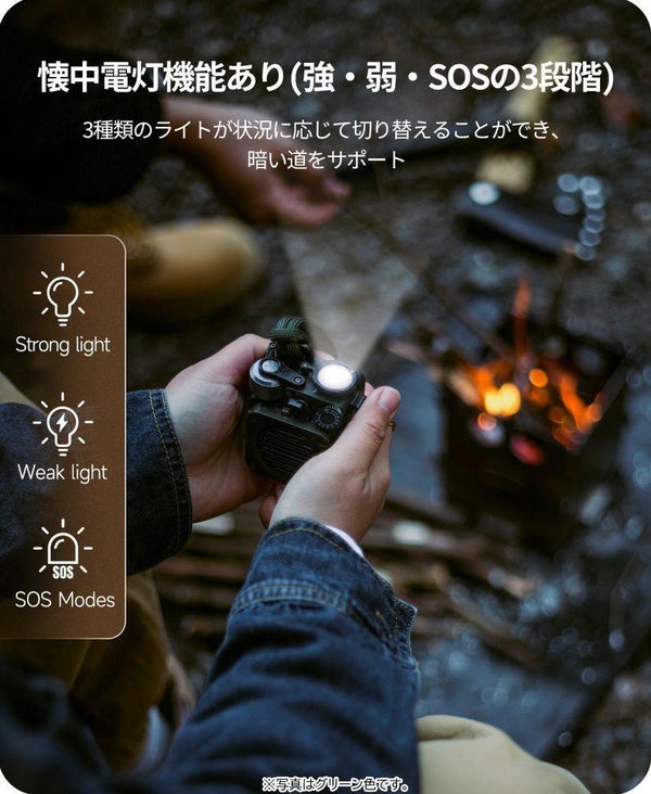 ミリタリー デザイン が魅力の Bluetooth スピーカー は、IPX5 防水 耐水 対応で アウトドア や キャンプ BBQ 釣り など幅広く活躍する ポータブル スピーカー です。1900mAh の バッテリー により や FM ラジオ 、 モバイルバッテリー 機能 を搭載し 防災グッズ としても便利。LED ライト は 懐中電灯 非常用 ライト として SOS 機能 も使用でき、緊急時にも対応します。Bluetooth5.0 による 安定 接続 と 低遅延 で クリア な 音質 を実現し、屋外 でも 室内 でも快適な リスニング を楽しめる 多機能 ワイヤレス スピーカー です。
