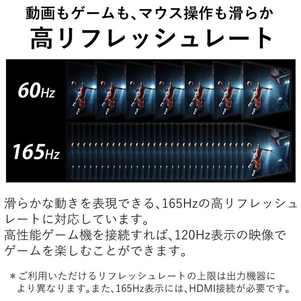 ※ご利用いただけるリフレッシュレートの上限は出力機器により異なります。また、165Hz表示には、HDMI接続が必要です。