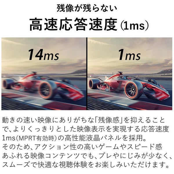 残像が残らない。動きの速い映像の残像感を削減し、映像をはっきりと表示する応答速度1ms(MPRT 有効時)の液晶を採用。動きの激しいゲームや映像も快適です。