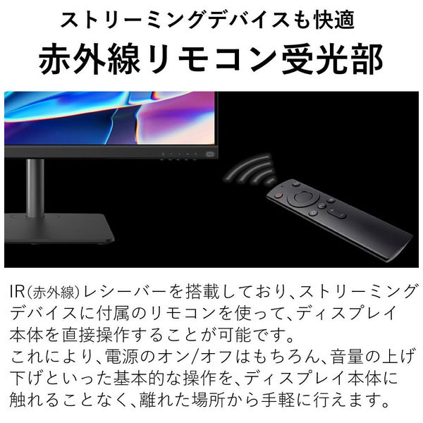 ストリーミングデバイス付属のリモコンからディスプレイの直接操作を可能にするIRレシーバーを搭載しているので、電源ON/OFFやボリューム調整が手元でかんたんにできます。