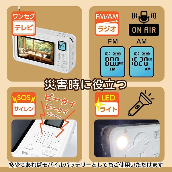 検索ワード:多摩電子工業 TSK145W ワンセグテレビ 4.3型 ラジオ LED 手回し充電 災害 日常使い AM FM 家庭用