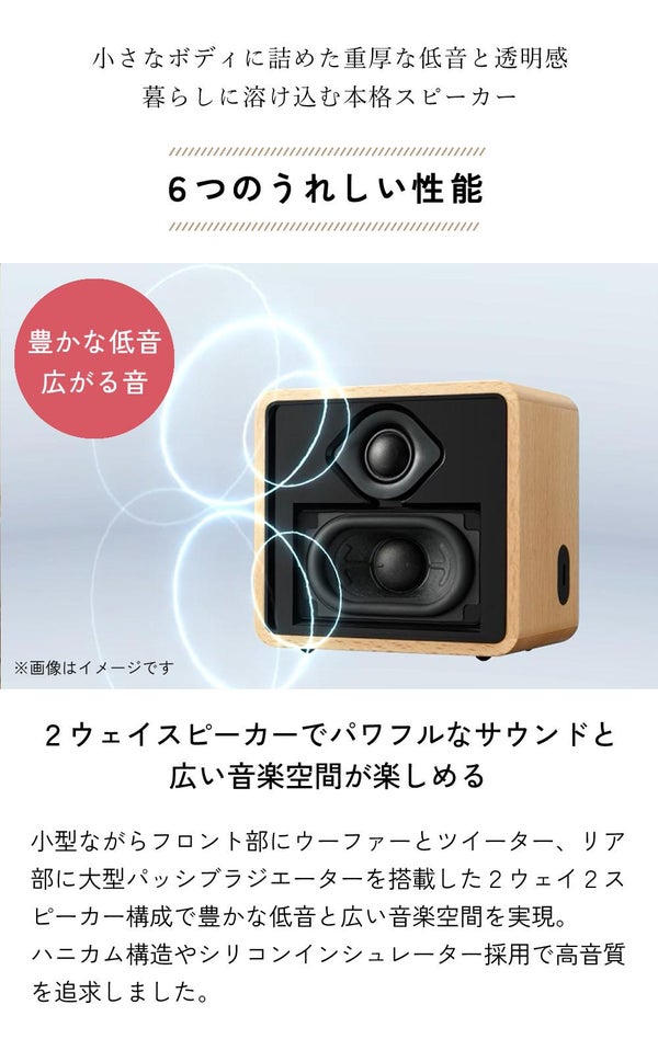 小型ながらフロント部にウーファーとツイーター、リア部に大型パッシブラジエーターを搭載した2ウェイ2スピーカー構成で、パワフルで豊かな低音と広い音楽空間を実現します。
