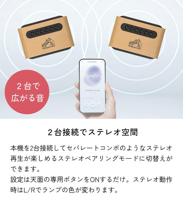 本機を2台接続してセパレートコンポのようなステレオ再生が楽しめるステレオペアリングモードに切替えができます。設定は天面の専用ボタンをONするだけ。ステレオ動作時はL/Rでランプの色が変わります。