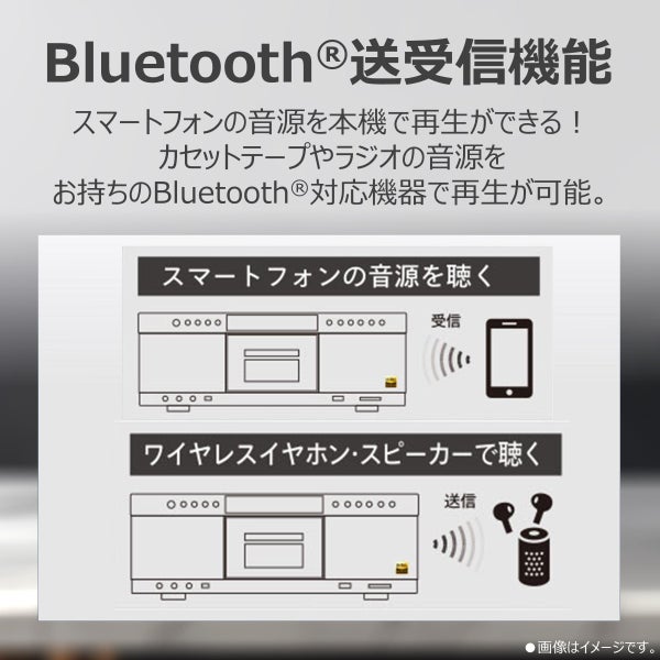 スマートフォンやポータブルプレーヤーから送信されたBluetooth(R)音源を受信して聴けるほか、本体で再生したカセットテープ、CD、SD、USB、外部入力音源、AM/FMラジオの音をワイヤレスイヤホン等のBluetooth(R)対応機器へ送信して聴くことができます。