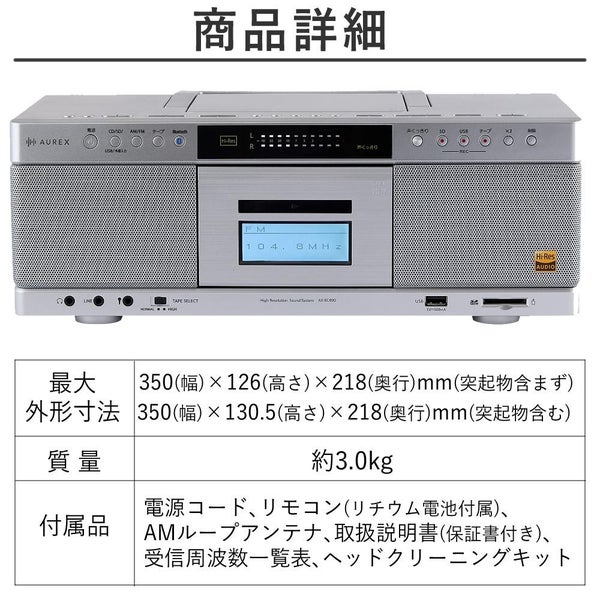 【付属品】電源コード、リモコン(リチウム電池付属)、AMループアンテナ、取扱説明書(保証書付き)、 受信周波数一覧表、ヘッドクリーニングキット |