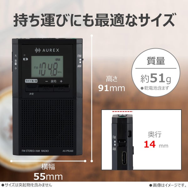 長時間 LEDライト搭載 の LEDライト付き ポケットラジオ 「 AX-PRU60 」 は、 USB充電 と 乾電池 の どちらでも 使える ポータブル ラジオ です。 ワイドFM や AMFM / FM/AM 受信 に対応 し、 緊急時 や 日常 の 情報収集 に 便利。 イヤホン端子 付き で 好み の イヤホン と 接続 可能。 コンパクト で 軽量 な ボディ に クロック 機能 も 搭載 し、 防災 用 や アウトドア でも 活躍 する 便利 な LEDライト付きラジオ です。