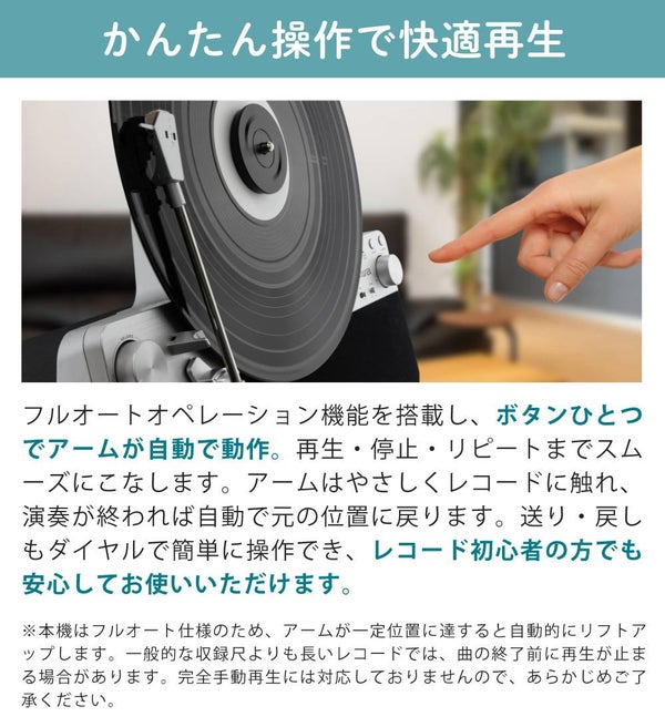 ボタンを押すだけで、アームがやさしくレコードに触れ、音楽が自然に流れ出します。再生が終われば、自動でアームが元の位置に戻る安心設計です。針を落とす手間も不安もいらないので、レコード初心者の方にもおすすめです。