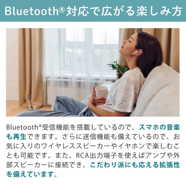 Bluetooth送信機能で、お気に入りのレコード音源をワイヤレスでスピーカーやヘッドホンで再生できます。深夜のひとり時間も、リビングでのくつろぎ時間も、配線に縛られず自由に音を楽しめます。Bluetooth受信機能を使えば、スマホの音楽もこの一台で再生可能です。