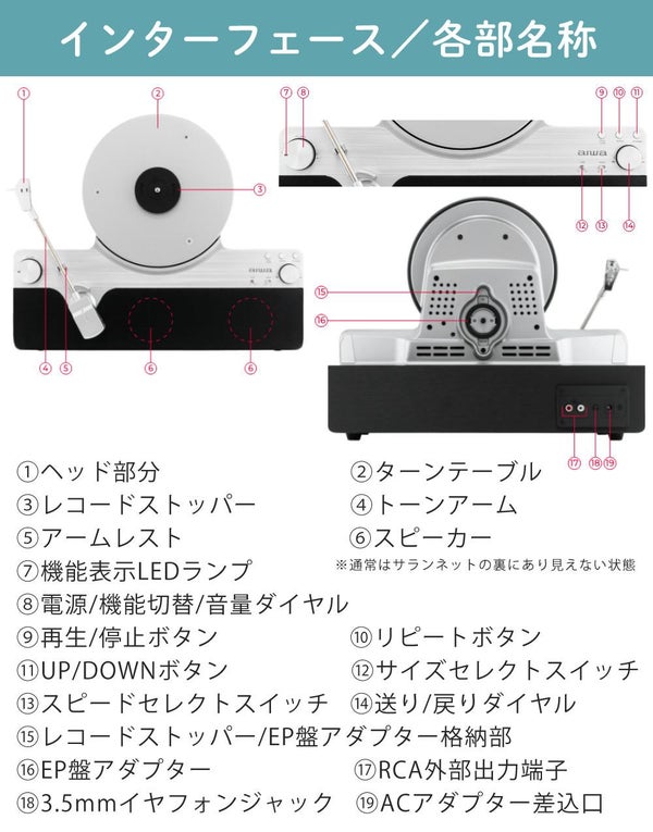 【付属品】取扱説明書(保証書付き)、ACアダプター、レコード固定用アダプター(EP盤対応) |