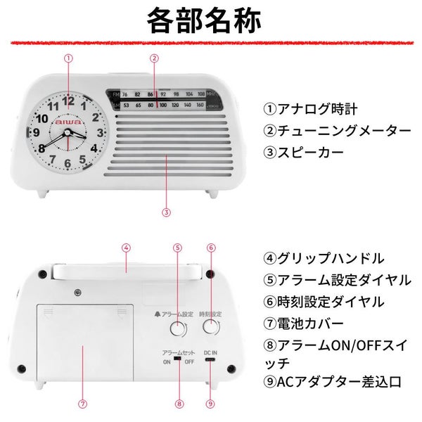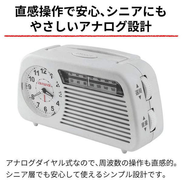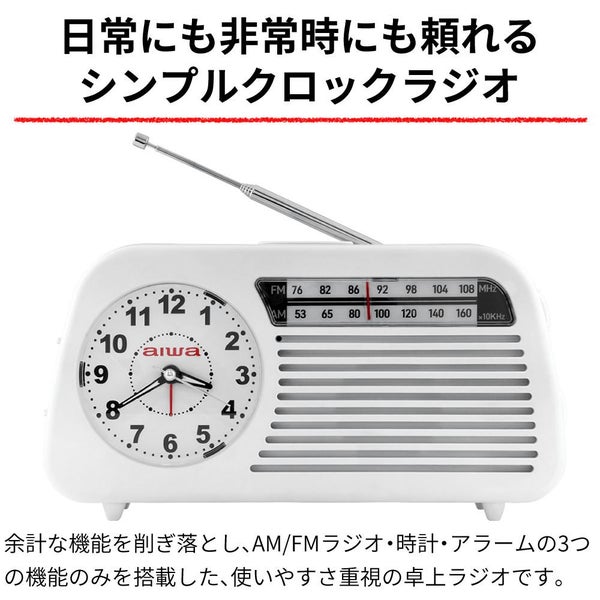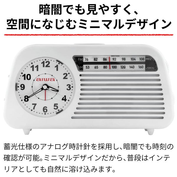 aiwa クロックラジオ GAA5-CLR0001 は AM FMラジオ と 時計機能 を備えた 卓上ラジオ です。 アナログラジオ の 見やすいダイヤル と シンプル操作 で、 シニア向けラジオ としても扱いやすく、 日常使い はもちろん 防災ラジオ としても活躍します。 電池式ラジオ と AC電源対応 により 長時間駆動 が可能で、 災害対策 や 非常用ラジオ として安心。 蓄光時計 や アラーム機能 を搭載し、 コンパクトラジオ でありながら 実用性 の高い ハンディラジオ として 幅広いシーン に対応します。