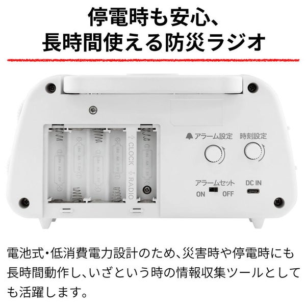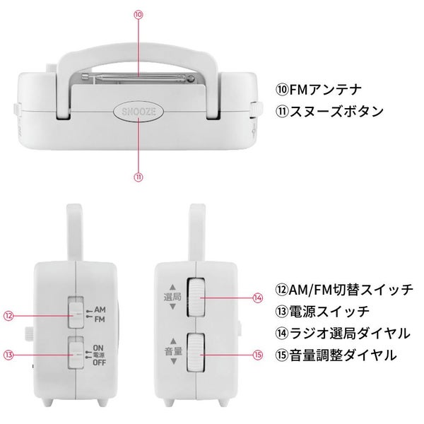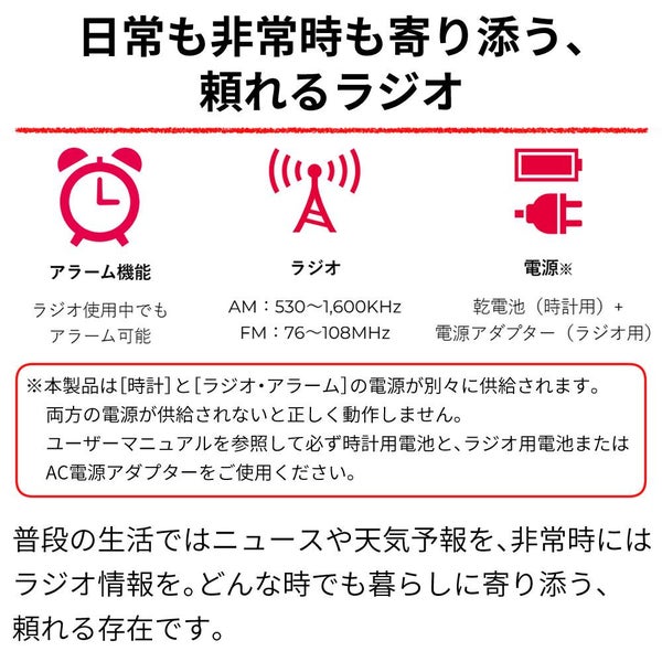 AM/FMラジオ、時計、アラームのシンプルな3つの機能のみを搭載した卓上ハンディラジオです。