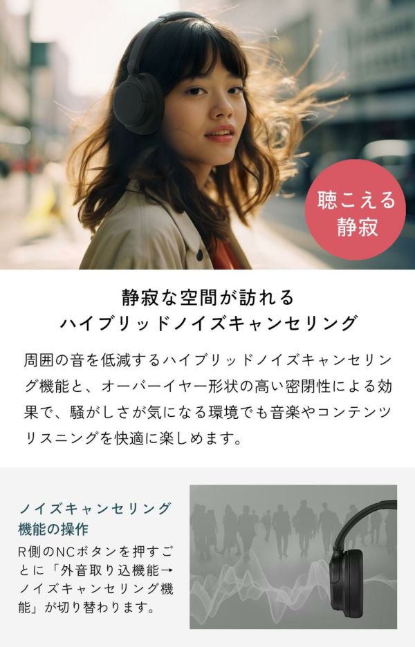 周囲の音を低減するハイブリッドノイズキャンセリング機能と、オーバーイヤー形状の高い密閉性による効果で、騒がしさが気になる環境でも音楽やコンテンツリスニングを快適に楽しめます。