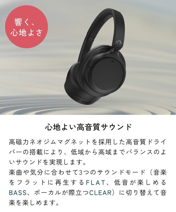 楽曲や気分に合わせて3つのサウンドモード(音楽をフラットに再生するFLAT、低音が楽しめるBASS、ボーカルが際立つCLEAR)に切り替えて音楽を楽しめます。