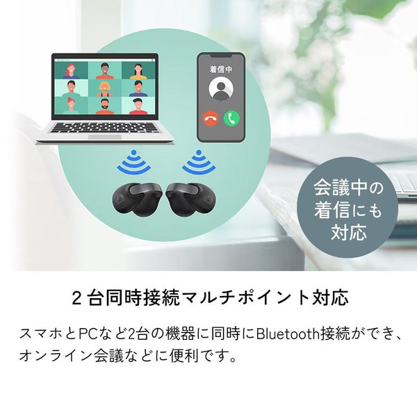 スマホとPCなど2台の機器に同時にBluetooth接続ができ、オンライン会議などに便利です。