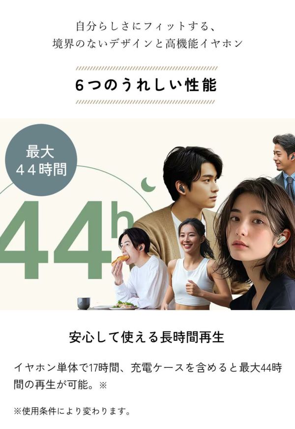 イヤホン単体で17時間、充電ケースを含めると最大44時間の再生が可能。※