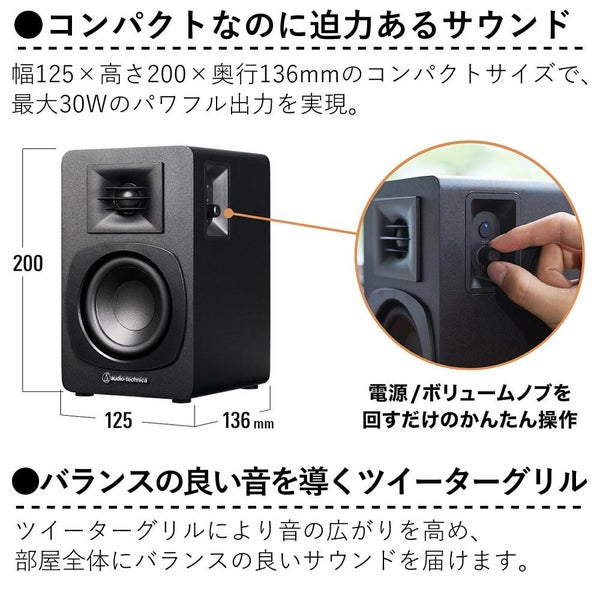 オーディオテクニカ の パワードスピーカー AT?SP3X は、 ブックシェルフスピーカー として コンパクト な 設計でありながら、 最大30W の 出力 を誇り、 フルレンジオーディオ を 実現します。 3インチ ウーファー と 1.1インチ ツイーター を 組み合わせ、 内蔵 DSP チューニング により バランス の 良い 高音質 を提供。 Bluetooth 接続 による ワイヤレスオーディオ に対応し、 マルチポイント Bluetooth で スマートフォン や レコードプレーヤー との 切り替えも 快適です。 RCA 入力 を備え、 アナログ 音質設計 にも 自信。 ミニマルデザイン と MDF エンクロージャー により 部屋 に 美しく 溶け込みつつ、 ツイーターグリル や バスレフダクト で 広がりのある 音場 を実現。 LED インジケーター の 簡単操作 も魅力です。