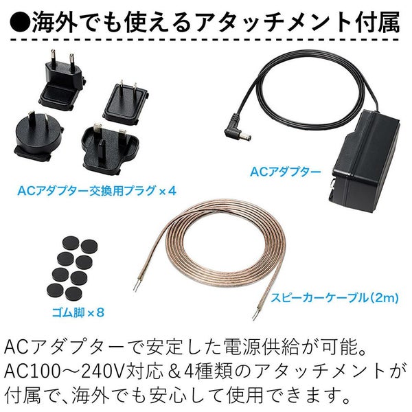 【付属品】ACアダプター、ACアダプター交換用プラグ×4、スピーカーケーブル(L/R接続用)、ゴム脚×8 |