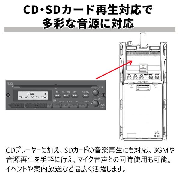 | CDプレーヤー部 | 表示:動作表示:液晶表示 バックライト:発光ダイオード(黄緑) 適合CD:音楽CD及びCD-R/RW ※12cmのみ、8cmは非対応 適合SDカード:SDA準拠SD/SDHCカード(容量32GBまで) ※SDXCは除く 適合USBメモリー:USBマスストレージクラス準拠USBメモリー(容量32GBまで) ファイルシステム:CD-R/RW:UDF1.02(シングルセッションに対応) SD/USB:FAT16、FAT32 ファイル保存最大数:音楽CD:99 MP3/WMA:999(CD-R/RW)、9999(SD/USB)(メディアの容量、および、ファイルに依存) フォルダー識別最大数:MP3/WMA:255(CD-R/RW)、999(SD/USB)(ルートディレクトリを含む) 音声圧縮伸長方式:MP3形式(MPEG1 Audio Layer3)、WMA形式(Windows Media Audio Ver.9) 再生ビットレート:MP3形式32kbps~320kbps、WMA形式48kbps~192kbps 再生ピードコントロール:-15%~+15%の可変 付帯機能:ギャップレス再生機能(ノンストップミックスCDのみ)、リピート選択(1曲リピート、フォルダーリピート、全曲リピート、フォルダーランダム、全曲ランダム)、A-Bリピート、プログラム再生、音量調節、スピードコントロール、経過時間表示、一時停止、スキップ機能、早送り早戻し機能、プログラム登録・編集・消去機能、自動バックライト機能 |