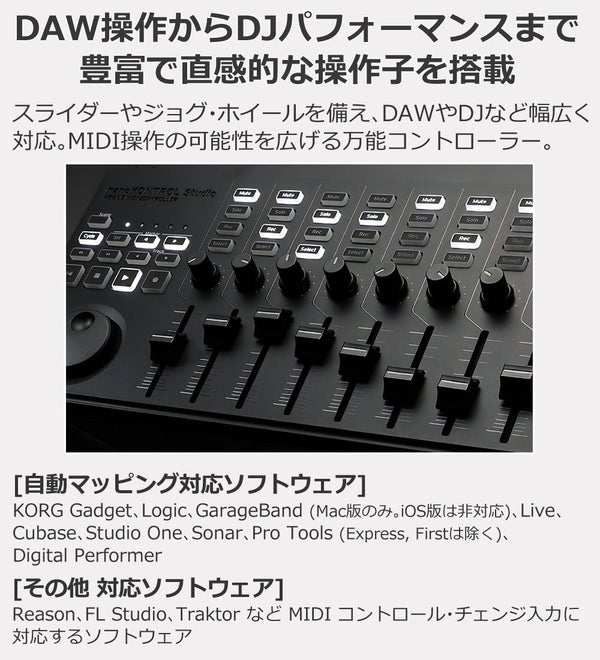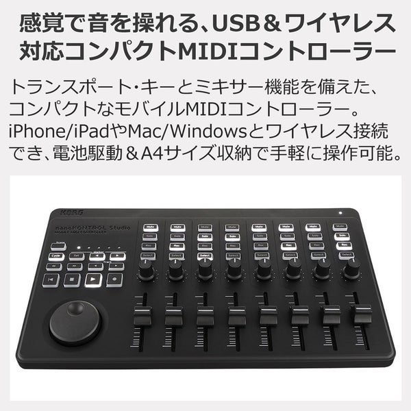KORG の nanoKONTROL Studio は、 Bluetooth 対応 の ワイヤレス MIDI コントローラー 。 DAW や iPad と接続し、 コンパクト な ボディ に フェーダー や ノブ を搭載し、 音楽制作 を効率化。