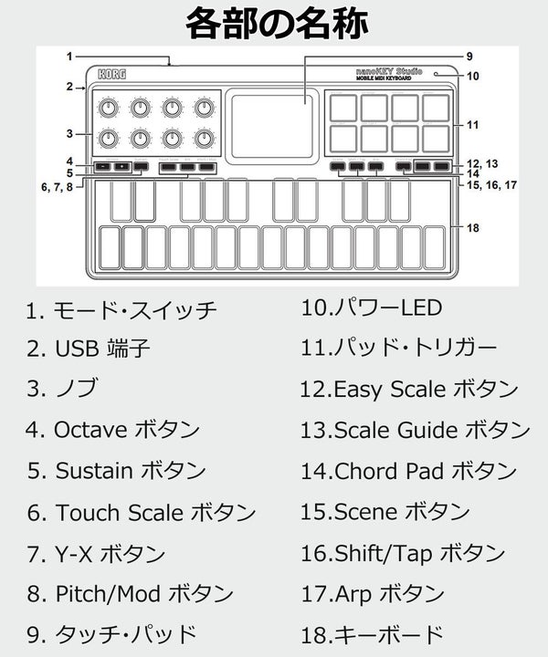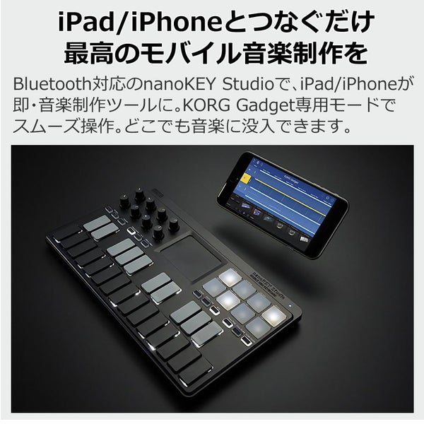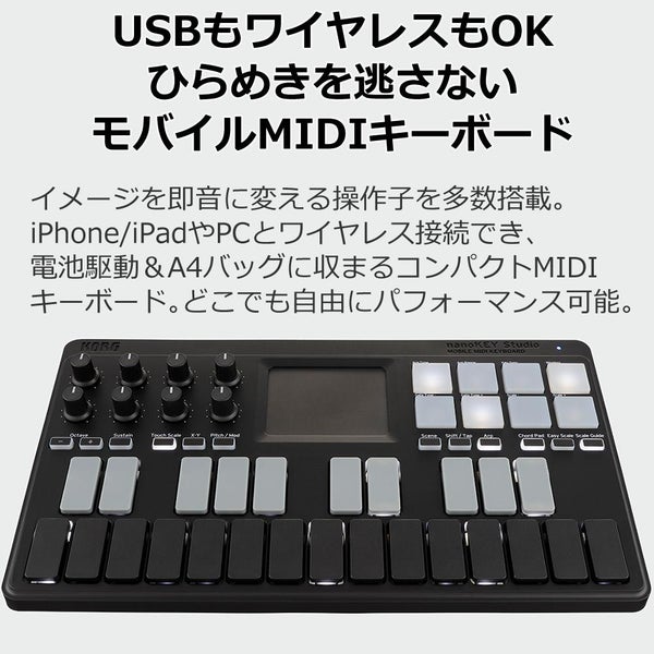 KORG の nanoKEY Studio は Bluetooth 対応 の モバイル MIDIキーボード 。 コンパクト な ボディで USB接続 も可能、 DTM や 音楽制作 に最適な ポータブル 音楽機材 です。