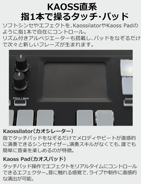 | コントローラー | 25鍵ベロシティ対応キーボード(カーブ4種)、トリガー・パッド×8(カーブ4種)、ノブ×8、X-Yパッド、Octave+/-、Sustain、Touch Scale、X-Y、Pitch/Mod、Scene、Shift/Tap、Arp、Chord Pad、Easy Scale、Scale Guide各ボタン |