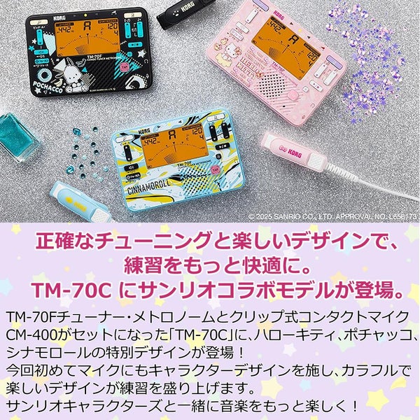 多彩な機能と高い視認性を備えたチューナー・メトロノーム TM-70F と、楽器に取り付けて振動を直接キャッチできるクリップ式コンタクト・マイク CM-400 がセットになった TM-70C に、ハローキティ、ポチャッコ、シナモロールのサンリオキャラクターズ特別デザインが登場!