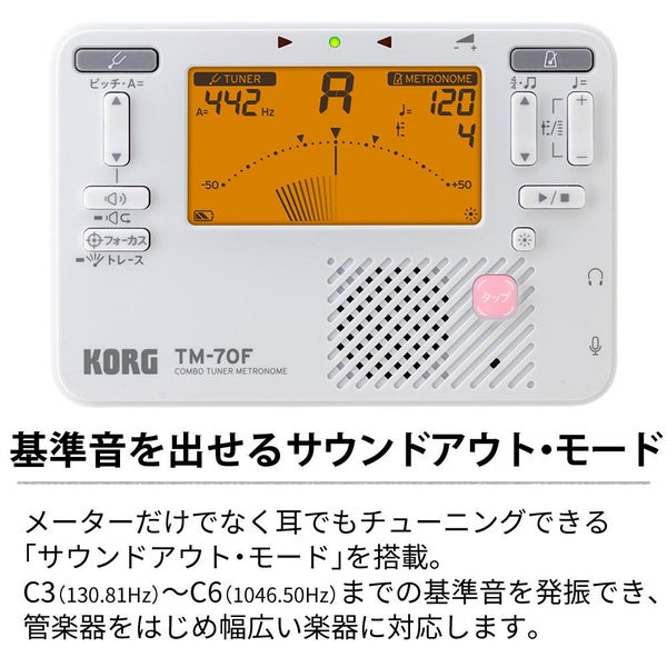 KORG コルグ TM-70F は、 チューナー と メトロノーム を 1台 に まとめた チューナーメトロノーム です。 管楽器 ・ 弦楽器 ・ ギター ・ ウクレレ ・ 声楽 ・ アカペラ まで 幅広く 対応し、 C1 ~ C8 の 測定範囲 と 液晶針式メーター で 音程 確認 を 快適 に サポート。 フォーカスモード ・ トレースモード ・ サウンドアウト ・ サウンドバック も 搭載し、 リズム練習 や 耳 の トレーニング に 便利です。 30 ~ 252 回/分 の テンポ設定 、 日本製 、 折りたたみスタンド 採用 の 使いやすい 1台 です。