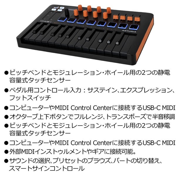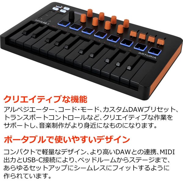ワールドクラスのMIDIコントローラーのMiniLab 3には業界標準のDAWから500を超えるシンセ&キーボード・プリセットまで、プレミアムな音楽制作ソフトウェアがフル・パッケージで提供されます。
