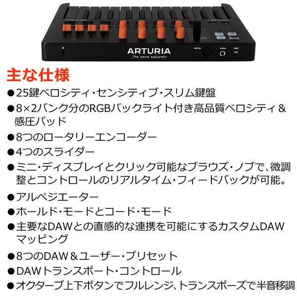 アルペジエーター、コード・モード、カスタムDAWプリセット、トランスポートコントロールなど、クリエイティブな作業をサポートし、音楽制作がより身近になものになります。