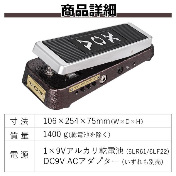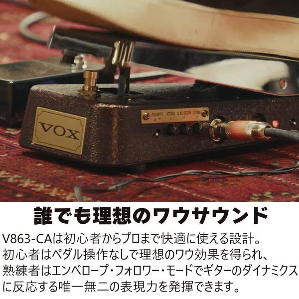 VOX の V863-CA は、伝統の ワウペダル に オートワウ機能 を搭載した革新的な ギターエフェクター です。 エンベロープ・ジェネレーター や エンベロープ・フォロワー を活用し、 ピッキング検出 により表現力豊かな ワウサウンド を実現。 Auto/Pedalモード で柔軟な サウンドメイク が可能で、初心者から上級者まで幅広い ギタリスト に最適。伝統の インダクター回路 を採用し、ライブや 音楽制作 にもおすすめの一台です。
