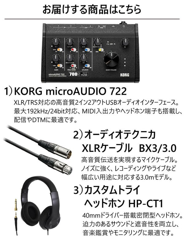 KORG microAUDIO 722 は アナログ フィルター を 搭載 した 珍しい オーディオ インターフェース で、 高音質 24bit 192kHz 対応 の USB?C 接続 タイプ。 コンパクト な ボディに プリアンプ や 低ノイズ 設計 を詰め込み、 Mac や Windows、 スマホ タブレット でも 快適 に 録音 配信 が 可能。 アナログ 由来 の サウンド は デジタル 処理 では得られない 表現力 を 引き出します。 さらに ループバック や ゼロレイテンシー ダイレクトモニタリング、 ノイズゲート コンプレッサー リミッター も 搭載。 Ableton Live Lite や iZotope Ozone Elements など ソフトも 充実し、すぐに 制作 を 始められます。