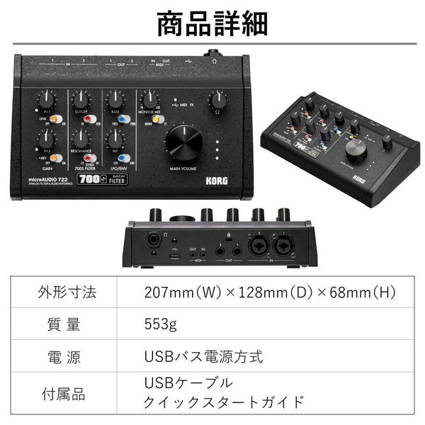 microAUDIO 722は、オーディオ?インターフェースにコルグの伝説的アナログ?フィルターを搭載したハイブリッドモデル。