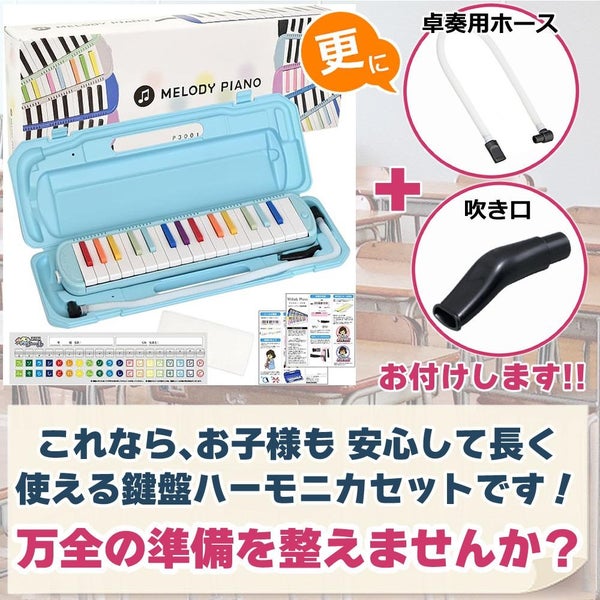 ※こちらの商品はYAMAHA鍵盤ハーモニカ「ピアニカ」・SUZUKI鍵盤ハーモニカ「メロディオン」ではございません。 P3001-32Kはピアニカやメロディオン同様に音楽の授業で使っていただくことは出来ますが、ホースや吹き口はヤマハ製ピアニカ・スズキ製メロディオンのものはご使用出来ませんのでご注意下さい。 |