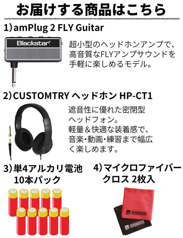 自宅 練習 にぴったりな ギター 愛好家 向けの コンプリートパック です。Blackstar amPlug?2?FLY ギター ヘッドホンアンプ では、 クリーン・クランチ・リード の 3 チャンネル と 特許取得 の ISF コントロール によって、思い通りの 音色調整 が可能。内蔵コーラス・ディレイ・リバーブの エフェクト を活かして、折りたたみ プラグ や 単四電池 駆動で 夜間 練習 や 出先 の演奏にも 対応。さらに Audio?Technica ATH?EP100 密閉型 ヘッドホン は 軽量 にして 40mm ドライバ を搭載、6.3mm 変換プラグ を付属し 楽器 接続 にも便利。10 本 セット の アルカリ単四電池 や クロス も含まれ、届いたその日から 快適 に 演奏 が始められます。