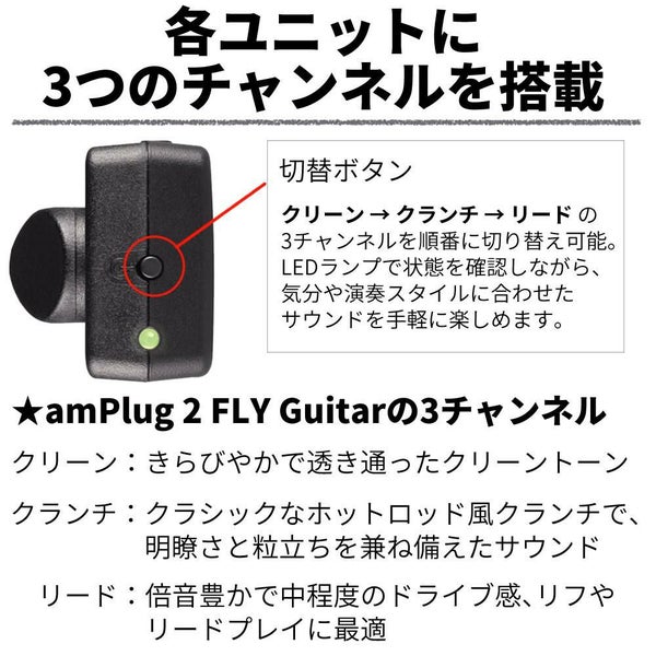 amPlug 2 FLY GuitarとamPlug 2 FLY Bassは両方とも、独自に調節可能な3つのチャンネルを備えています。amPlug 2 FLY Guitarはクリーン、クランチ、リードチャンネル、そしてamPlug 2 FLY BASSはクラシック、モダン、オーバードライブチャンネルとなります。