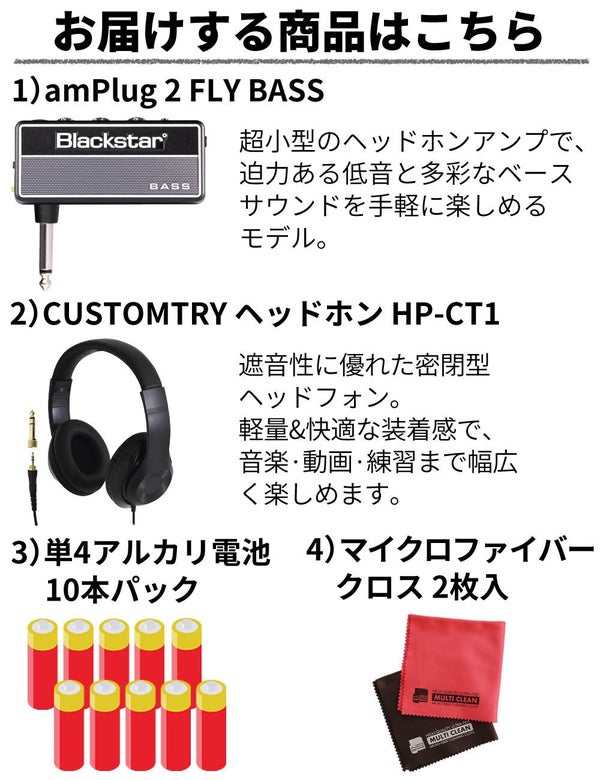 Blackstar amPlug2 FLY BASS ヘッドホンアンプ と audio?technica ATH?EP100 密閉型ヘッドホン がセットになっており、自宅 練習 用 や 夜間 練習 に最適です。amPlug2 FLY BASS は Classic/Modern/Overdrive の 3 チャンネル を備え、内蔵 リズムループ や AUX入力 により 好きな トーン /グルーヴ に合わせて練習可能。ATH?EP100 は 軽量 ボディ と φ40mm ドライバー を搭載し、中高域 から 低域 の バランス が良く、音漏れしにくい 密閉型 で長時間の 使用 でも 疲れにくいのが 特長。さらに 単四乾電池10本 と クロス 付きで、すぐに 演奏 や 練習 が始められる コスパ 重視 の セット です。