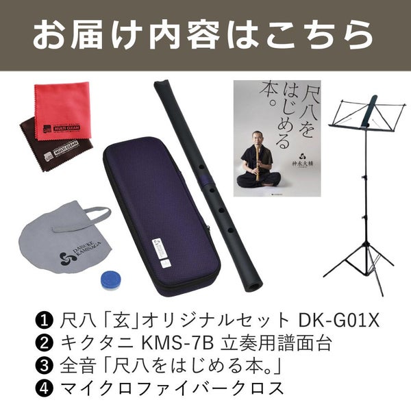 「全音 尺八 「玄」 オリジナルセット 神永大輔・監修 DK-G01X」と「キクタニ 立奏用譜面台 KMS-7B」、「全音『尺八をはじめる本。』」、「マイクロファイバークロス」の4点を組み合わせた、初心者に最適なスターターセットです。