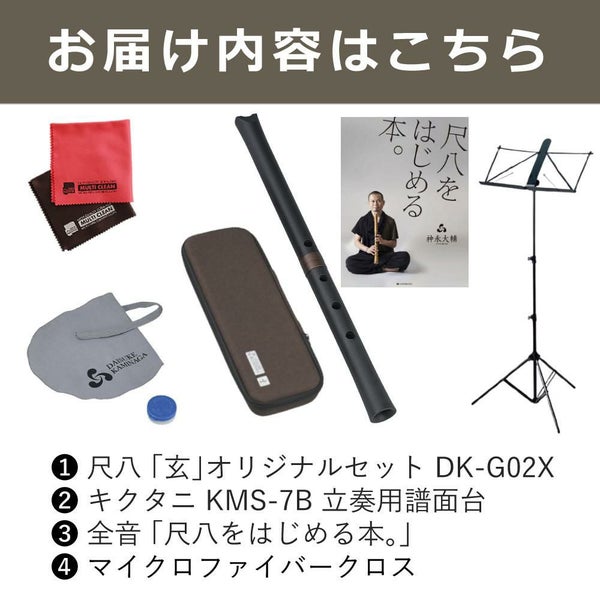 「全音 尺八 「玄」 オリジナルセット 神永大輔・監修 DK-G02X」と「キクタニ 立奏用譜面台 KMS-7B」、「全音『尺八をはじめる本。』」、「マイクロファイバークロス」の4点を組み合わせた、初心者に最適なスターターセットです。