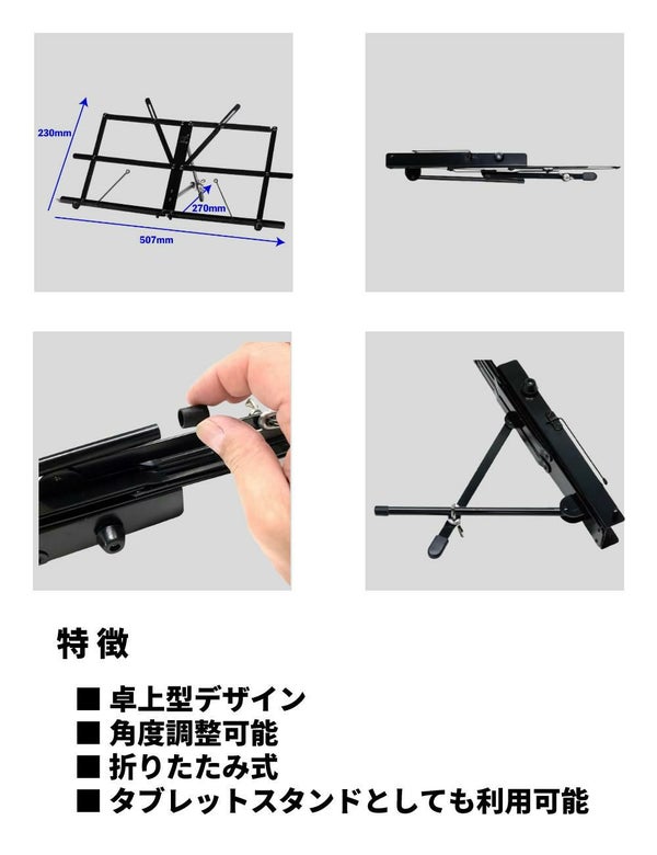 譜面やタブレットを最適な角度に調整でき、快適な視認性を確保します。