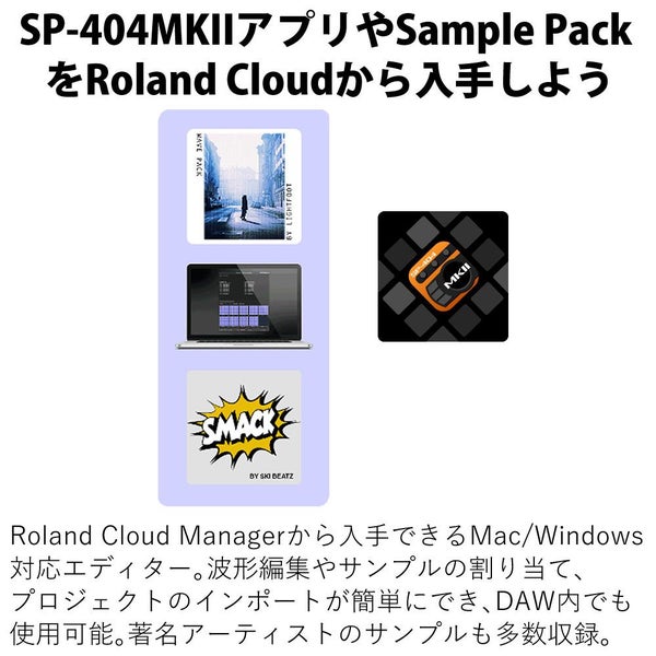 Roland CloudのMac/Windows専用SP-404MKIIアプリは、詳細な波形編集やパッド割り当て、MIDIや旧モデルプロジェクトのインポートを簡単に実行可能。MacではAU/VST3対応でDAW連携でき、著名アーティスト制作のサンプルパックも活用できます。