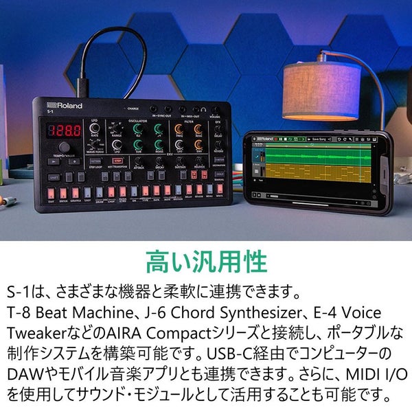 T-8 Beat Machine、J-6 Chord Synthesizer、E-4 Voice Tweakerなど他のAIRA Compactとリンクして、ポータブルでクリエイティブなシステムを構築したり、USB-C経由でコンピューターのDAWSやモバイル・ミュージック・アプリと連携することも可能。