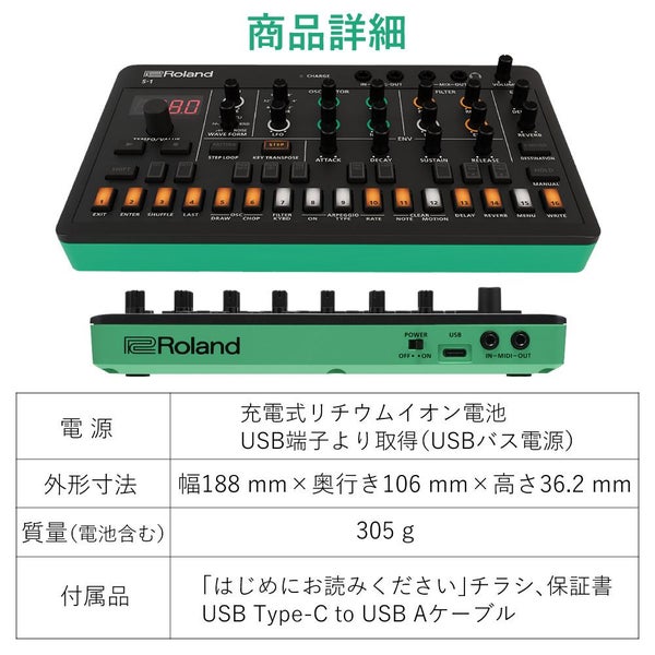 Roland S-1 は SH-101 にインスパイアされた ポータブルシンセ です。 ACB テクノロジー により 往年 の サウンド を 再現 し、 4ポリフォニー 対応 の ポリシンセ として コード演奏 や ユニゾン も 可能。 64ステップシーケンサー や アルペジエーター、 OSC DRAW ・ OSC CHOP、 D-Motion 機能 を 搭載 し、 本格的 な サウンドデザイン を 実現 します。 ディレイ ・ リバーブ ・ コーラス の エフェクト内蔵、 USB-C による AUDIOインターフェース / MIDI対応 で DAW連携 も スムーズ。 バッテリー内蔵 の 小型シンセ で モバイル音楽制作 に 最適 です。