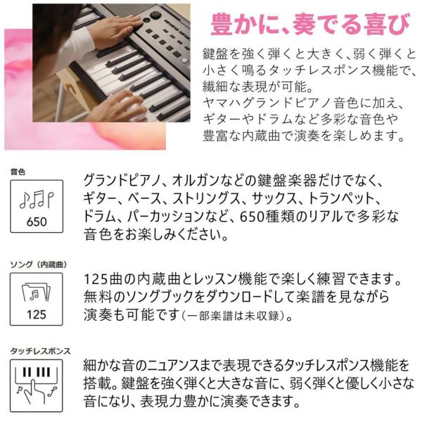 ・さらに、ヤマハグランドピアノの美しい音色に加えて、ギターやベース、ドラムなどの多彩な音色や、豊富な内蔵曲で演奏の楽しみが広がります。