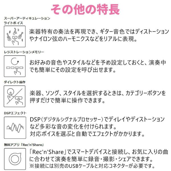 | ファンクション:デュアル ○、スプリット ○、パネルサスティン ○、アルペジオ 152、メロディーキャンセル ○、アーティキュレーション ○(12スーパーアーティキュレーションライト音色) |