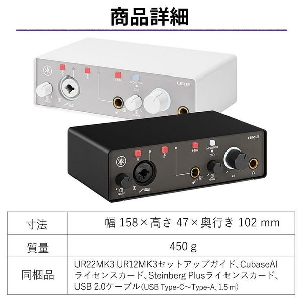 | 同梱品 | UR12MK3 UR12MK3セットアップガイド、Cubase AIライセンスカード、Steinberg Plusライセンスカード、USB 2.0ケーブル(USB Type-C~Type-A、1.5 m) |