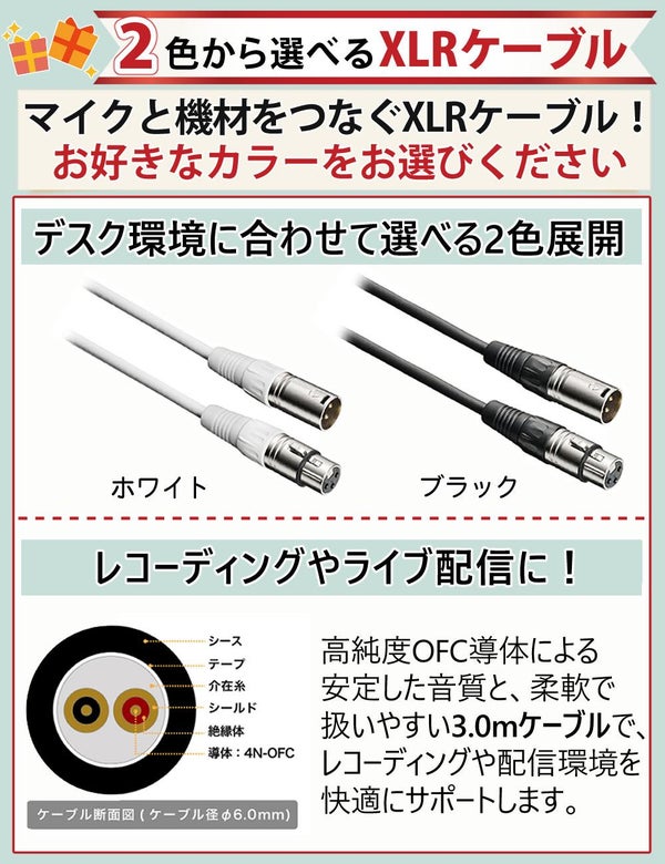 マイクとオーディオインターフェイスやミキサーを接続でき、自宅録音や配信、ボイスチャットに便利。