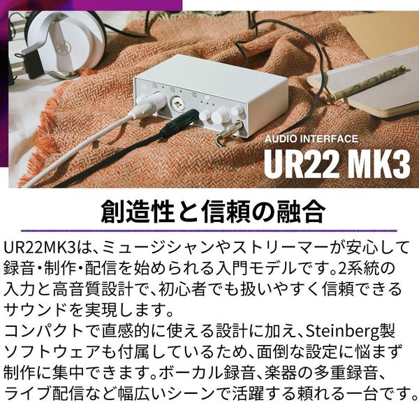 UR22MK3は、セットアップが簡単で直感的に使えるコンパクトで多用途なオーディオインターフェースであり、Steinbergの音楽制作/作ソフトウェアも付属しています。