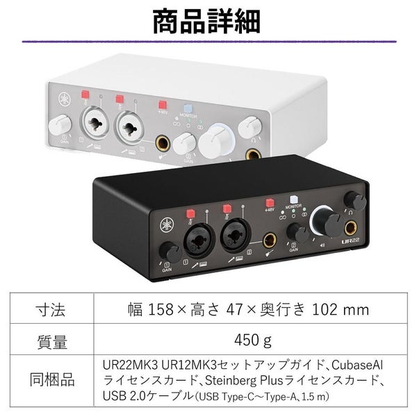 | 同梱品 | UR22MK3 UR12MK3セットアップガイド、Cubase AIライセンスカード、Steinberg Plusライセンスカード、USB 2.0ケーブル(USB Type-C~Type-A、1.5 m) |