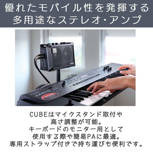 MB-CUBEはマイク・スタンドに取り付けて使用することも可能です。最適な高さと位置に調整することができるので、キーボードのモニター用として使用する際や、簡易PAとして使用する際などに自由度の高い設定がございます。さらに、持ち運びに便利な専用ストラップも付属しています。